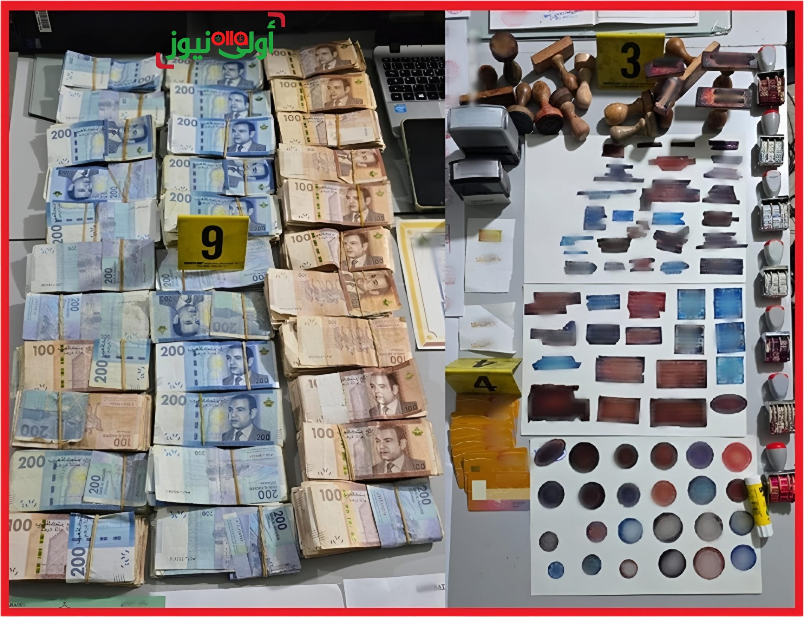 كما مكنت عملية التفتيش أيضا من العثور بحوزة المشتبه فيه على ثلاثة أجهزة كمبيوتر ومجموعة من الوثائق والشواهد الدراسية المزورة، فضلا عن خمسة كنانيش للحالة المدنية لا تحمل أية بيانات وعليها أختام وتوقيعات مزورة، وكذا مبلغ مالي قدره 30 مليون سنتيم يشتبه في كونه من متحصلات هذا النشاط الإجرامي.