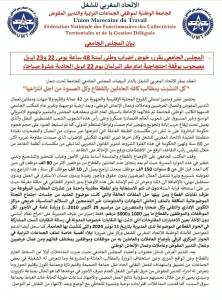 الجامعة الوطنية لموظفي الجماعات الترابية والتدبير المفوض تقرر خوض إضراب وطني بالجماعات الترابية لمدة يومين 22 و 23 ابريل2025 و وقفة احتجاجية أمام مقر البرلمان يوم 22 ابريل 2025 على الساعة الحادية عشر صباحا ✌️✌️
