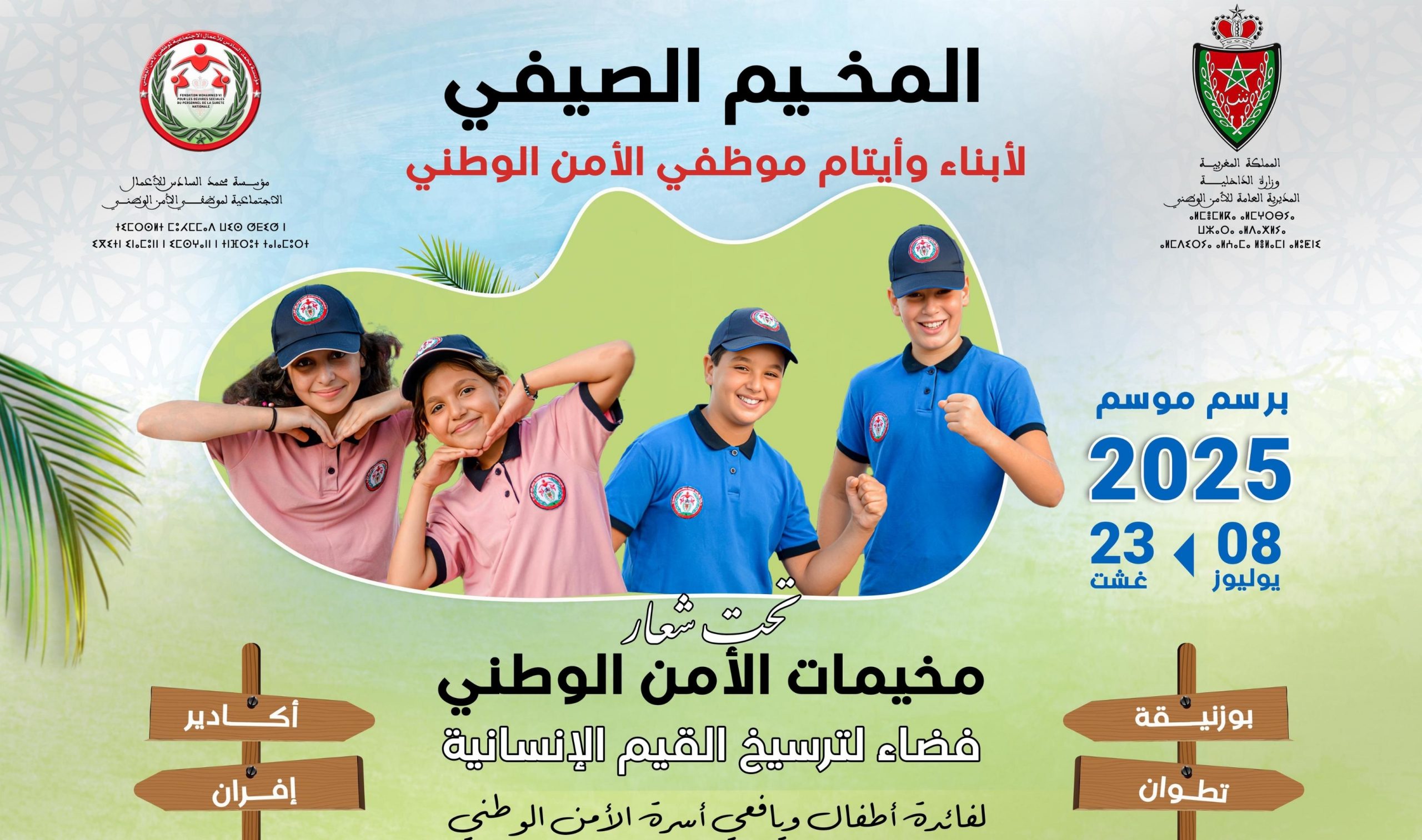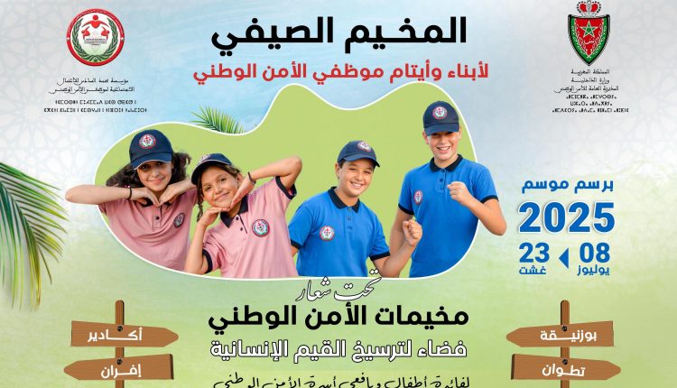 تحت شعار: “مخيمات الأمن الوطني: فضاء لترسيخ القيم الإنسانية”، فتحت مؤسسة محمد السادس للأعمال الاجتماعية لموظفي الأمن الوطني، خلال الأسبوع الجاري، أبواب التسجيل أمام أطفال وأيتام موظفي الأمن الوطني من أجل الاستفادة من فعاليات النسخة السنوية للمخيمات الصيفية 2025، والتي سيتم تنظيمها خلال الفترة الممتدة ما بين 08 يوليوز و23 غشت 2025، بمجموعة من مراكز الاصطياف بمدن أكادير وبوزنيقة وتطوان وإفران.
