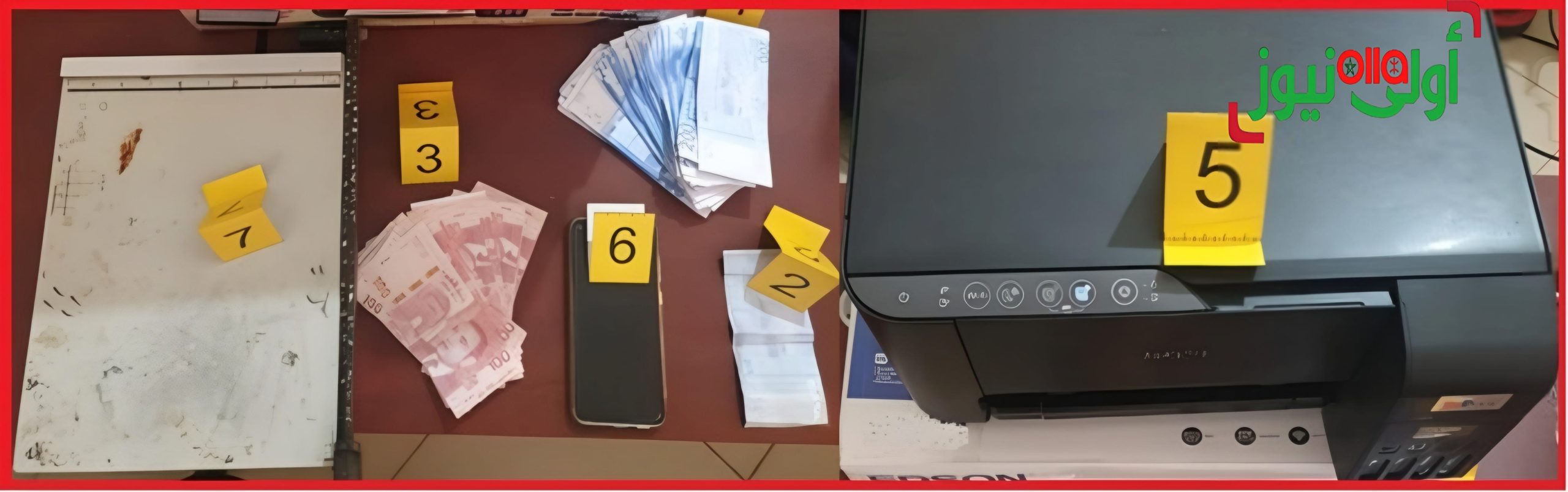 وقد مكنت عملية التفتيش المنجزة بداخل منزل المشتبه فيه من حجز جهاز للنسخ والطبع بالألوان ومجموعة من الأوراق والأدوات المكتبية، علاوة على جهاز إلكتروني يشتبه في احتوائه على آثار رقمية لهذا النشاط الإجرامي.
