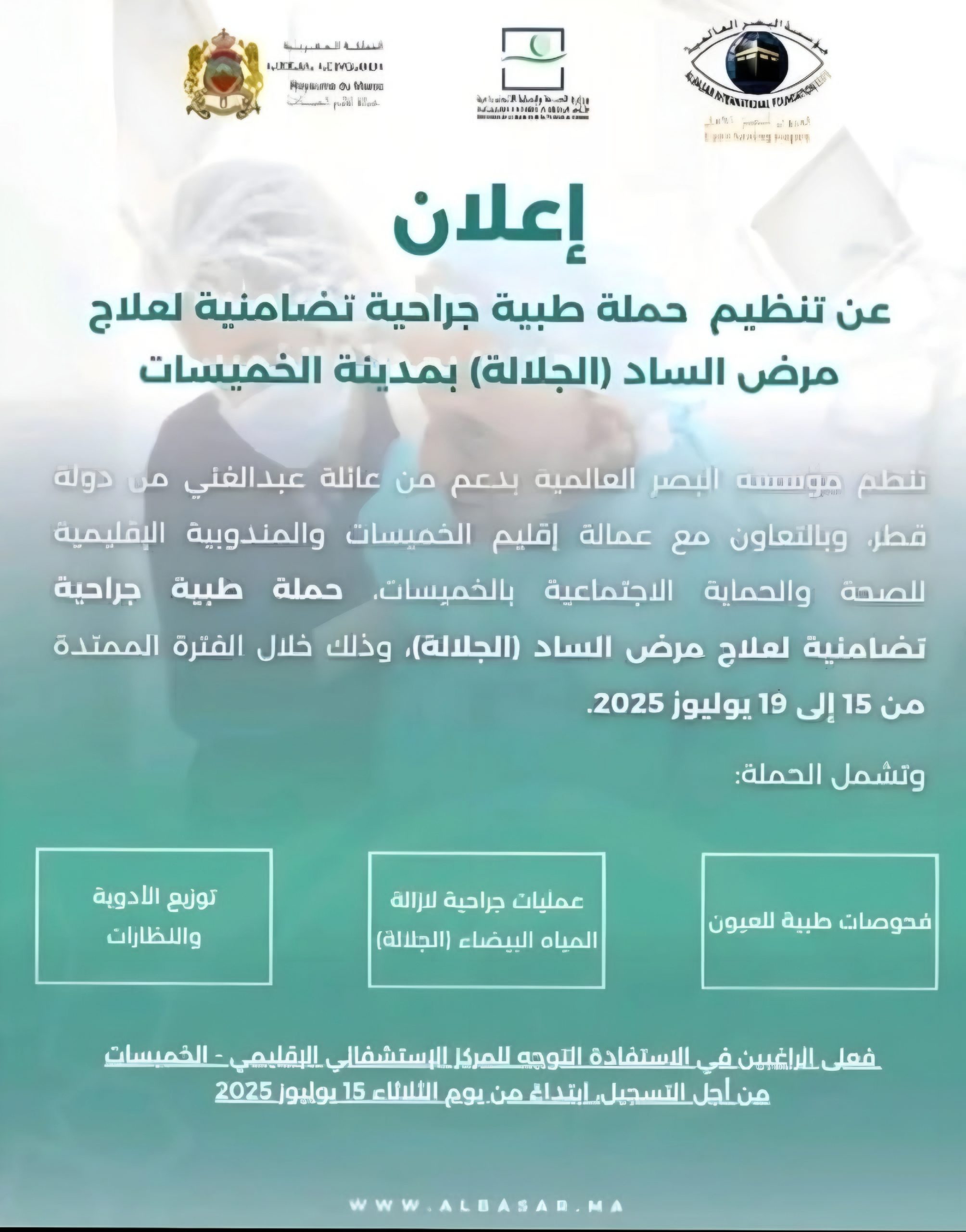 وأشار خرماز إلى أن عملية تسجيل واستقبال المرتفقين ستتم بالنادي النسوي بحي السلام بمدينة الخميسات خلال الفترة نفسها، أي من 15 إلى 19 يوليوز، حيث سيتم إخضاع المستفيدين للفحوصات القبلية وتوجيه المؤهلين منهم لإجراء العمليات الجراحية بالمستشفى الإقليمي.تحت إشراف طاقم طبي مختلط مغاربة واجانب
