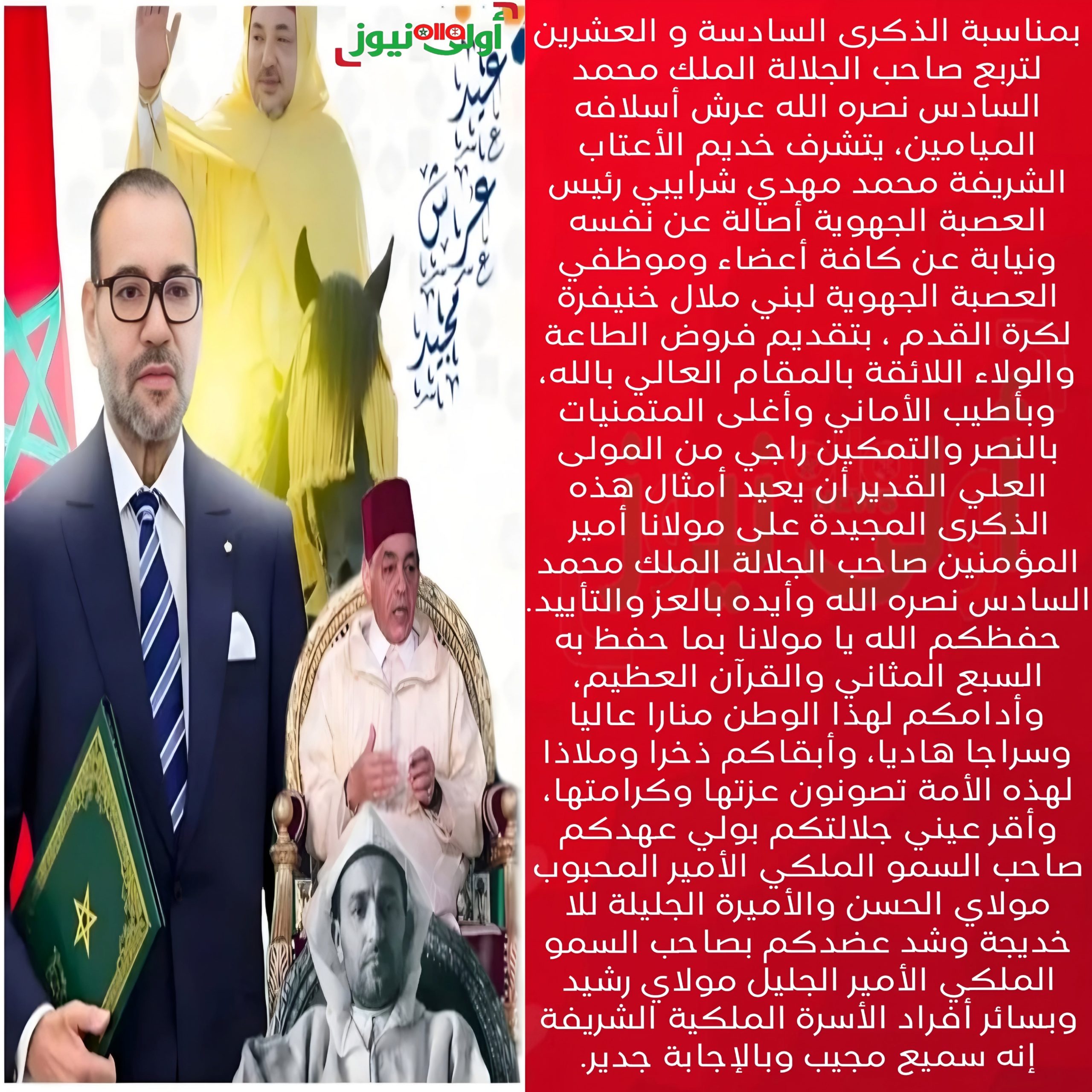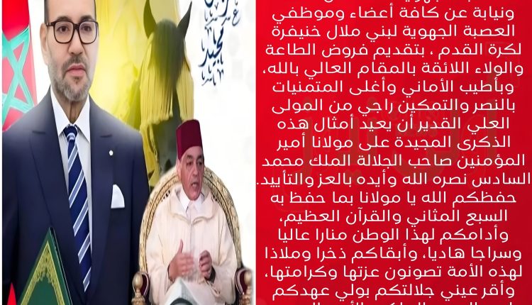 بمناسبة الذكرى السادسة و العشرين لتربع صاحب الجلالة الملك محمد السادس نصره الله عرش أسلافه الميامين، يتشرف خديم الأعتاب الشريفة محمد مهدي شرايبي رئيس العصبة الجهوية أصالة عن نفسه ونيابة عن كافة أعضاء وموظفي العصبة الجهوية لبني ملال خنيفرة لكرة القدم ، بتقديم فروض الطاعة والولاء اللائقة بالمقام العالي بالله، وبأطيب الأماني وأغلى المتمنيات بالنصر والتمكين راجي من المولى العلي القدير أن يعيد أمثال هذه الذكرى المجيدة على مولانا أمير المؤمنين صاحب الجلالة الملك محمد السادس نصره الله وأيده بالعز والتأييد.