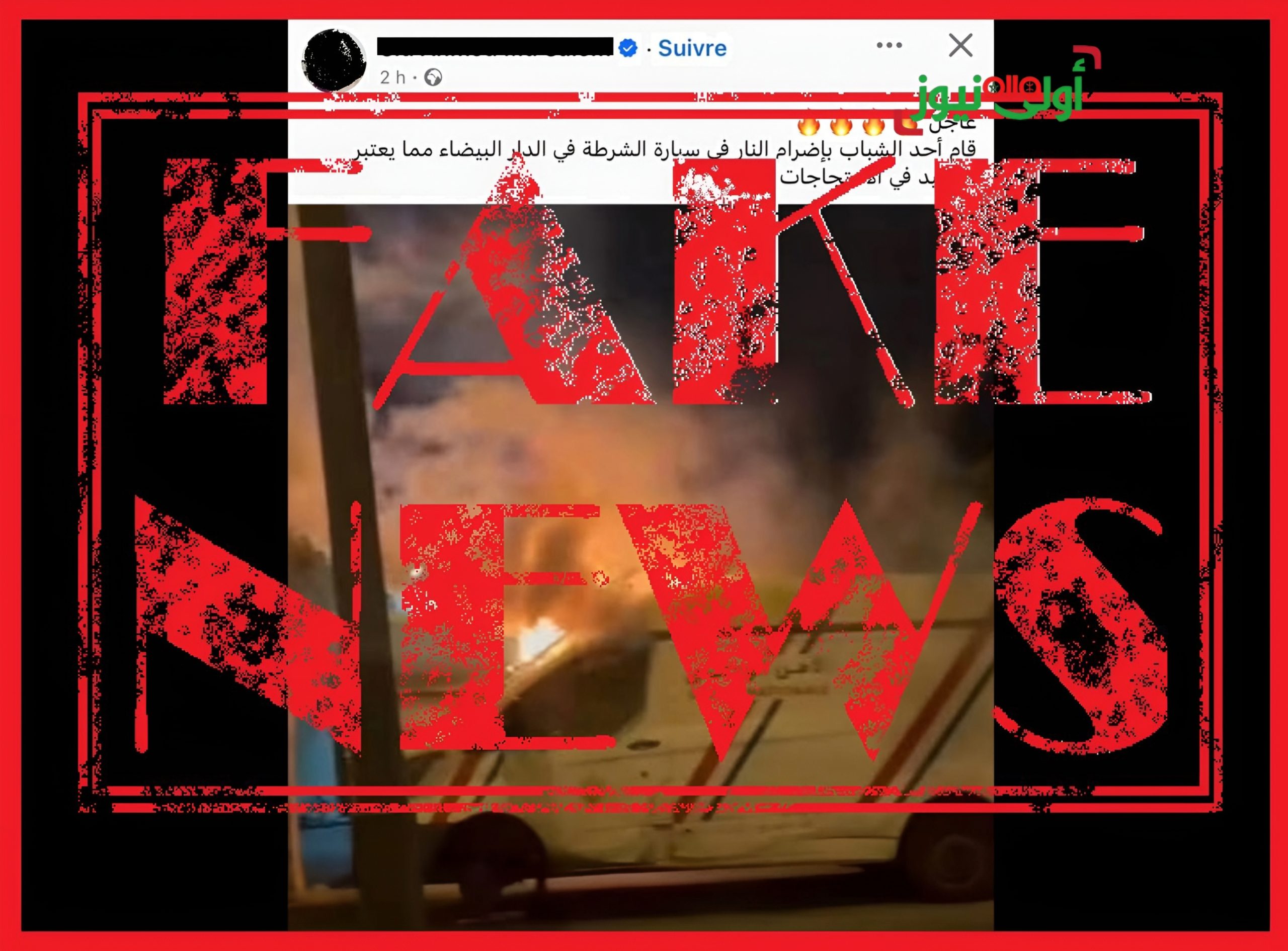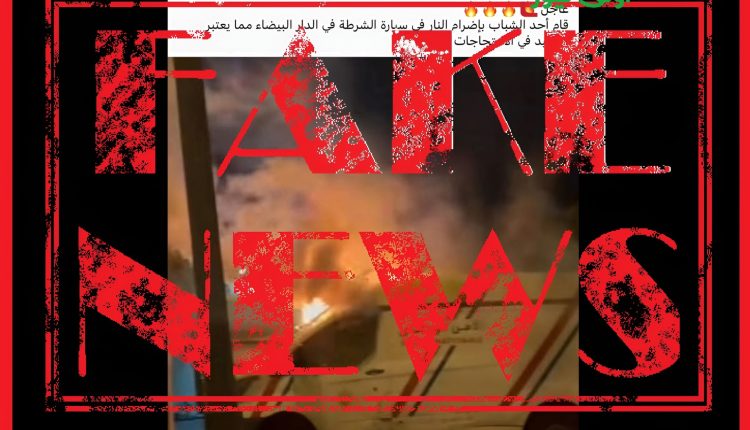 تنفي المديرية العامة للأمن الوطني، بشكل قاطع، صحة الادعاءات المرفقة بصورة منشورة على صفحات مواقع التواصل الاجتماعي، زوال اليوم الثلاثاء 30 شتنبر 2025، تظهر اشتعال النار بسيارة للشرطة، والمشفوعة بتعليق كاذب يزعم أن أحد الأشخاص قام بإضرام النار بهذه السيارة أثناء شكل احتجاجي بالشارع العام يوم أمس بمدينة الدار البيضاء.