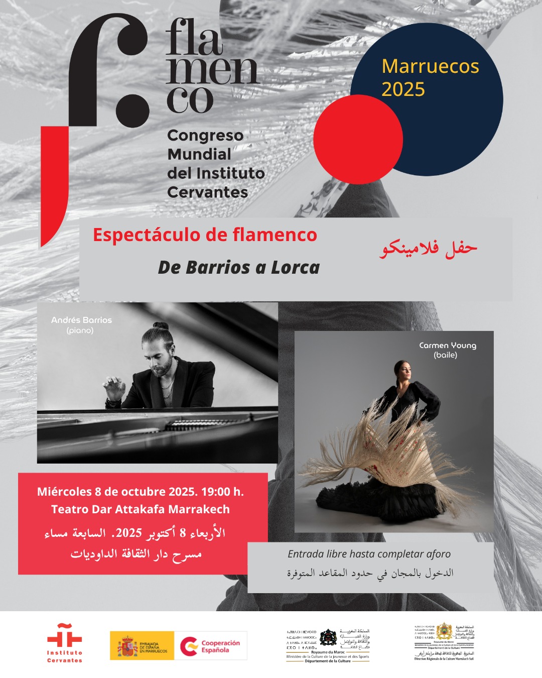 باريوس، الذي يُعد من أبرز وجوه جيله، يقدّم رؤية معاصرة للفلامنكو تنفتح على الجاز والموسيقى الأفرو-كوبية وتستند إلى تكوينه الكلاسيكي المتين. أما كارمن يونغ، فتتألق كأحد أبرز الأصوات الصاعدة في هذا الفن، حيث تجمع بين التقنية العالية والأناقة والقوة التعبيرية التي مكنتها من الوقوف على خشبة واحدة مع أسماء لامعة مثل ماريا خونكال، خافيير لاتوري، وأنطونيو مولينا “تشورو”.