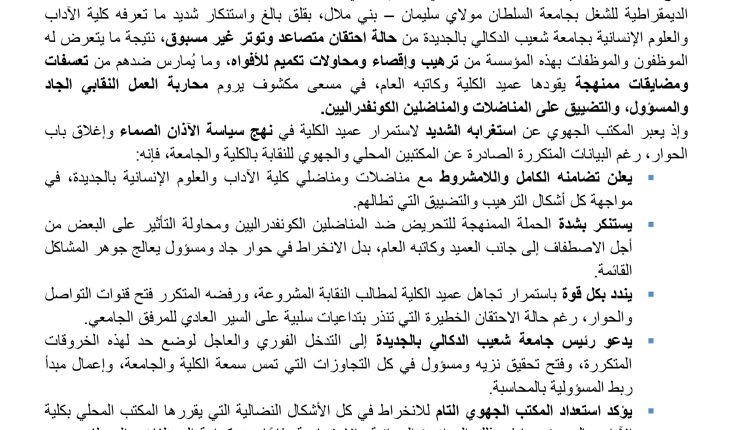 بيان تضامني ل*المكتب الجهوي بجامعة السلطان مولاي سليمان يندد بالتضييق على العمل النقابي بكلية الآداب والعلوم الإنسانية بالجديدة*