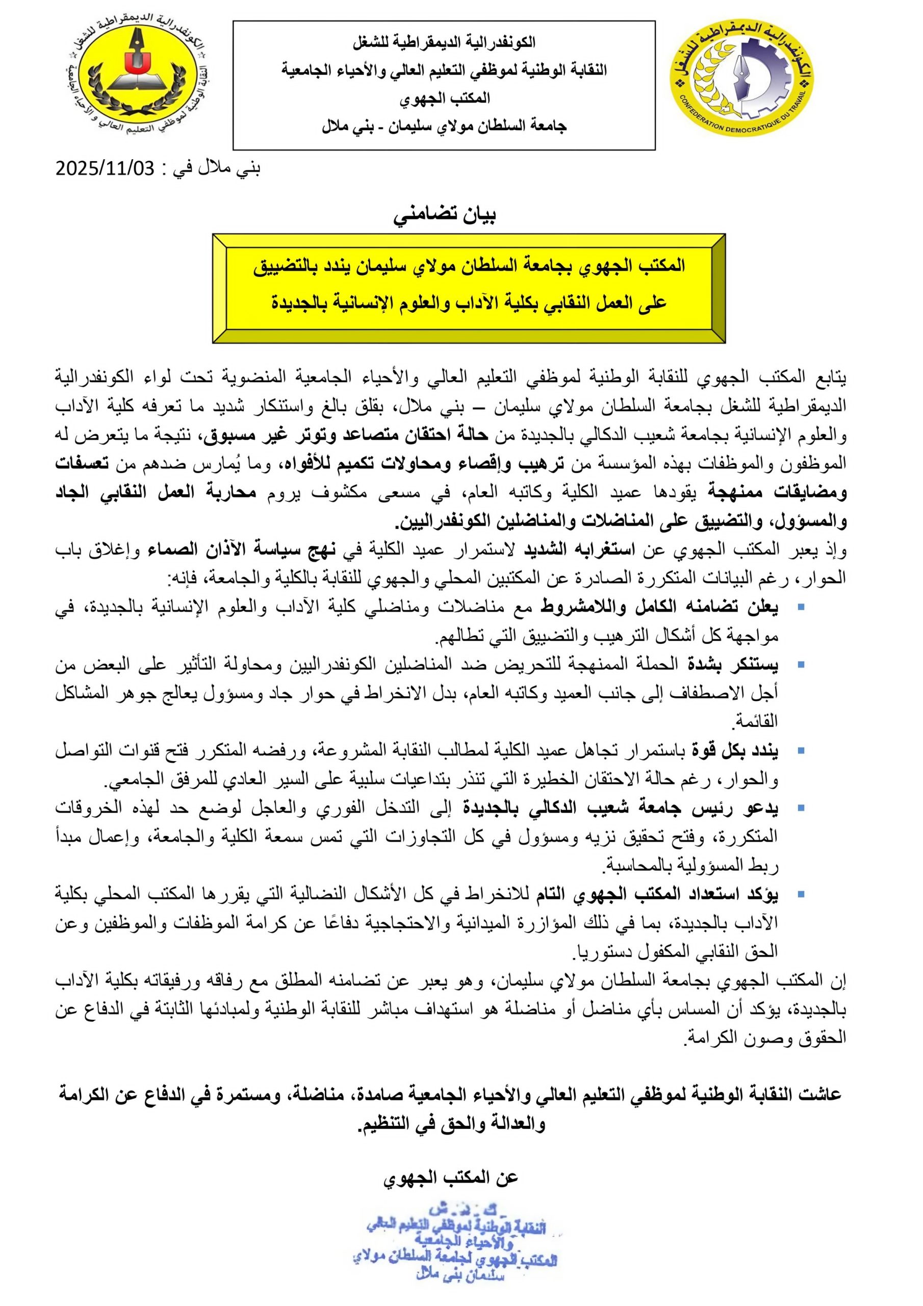 إن المكتب الجهوي بجامعة السلطان مولاي سليمان، وهو يعبر عن تضامنه المطلق مع رفاقه ورفيقاته بكلية الآداب بالجديدة، يؤكد أن المساس بأي مناضل أو مناضلة هو استهداف مباشر للنقابة الوطنية ولمبادئها الثابتة في الدفاع عن الحقوق وصون الكرامة.