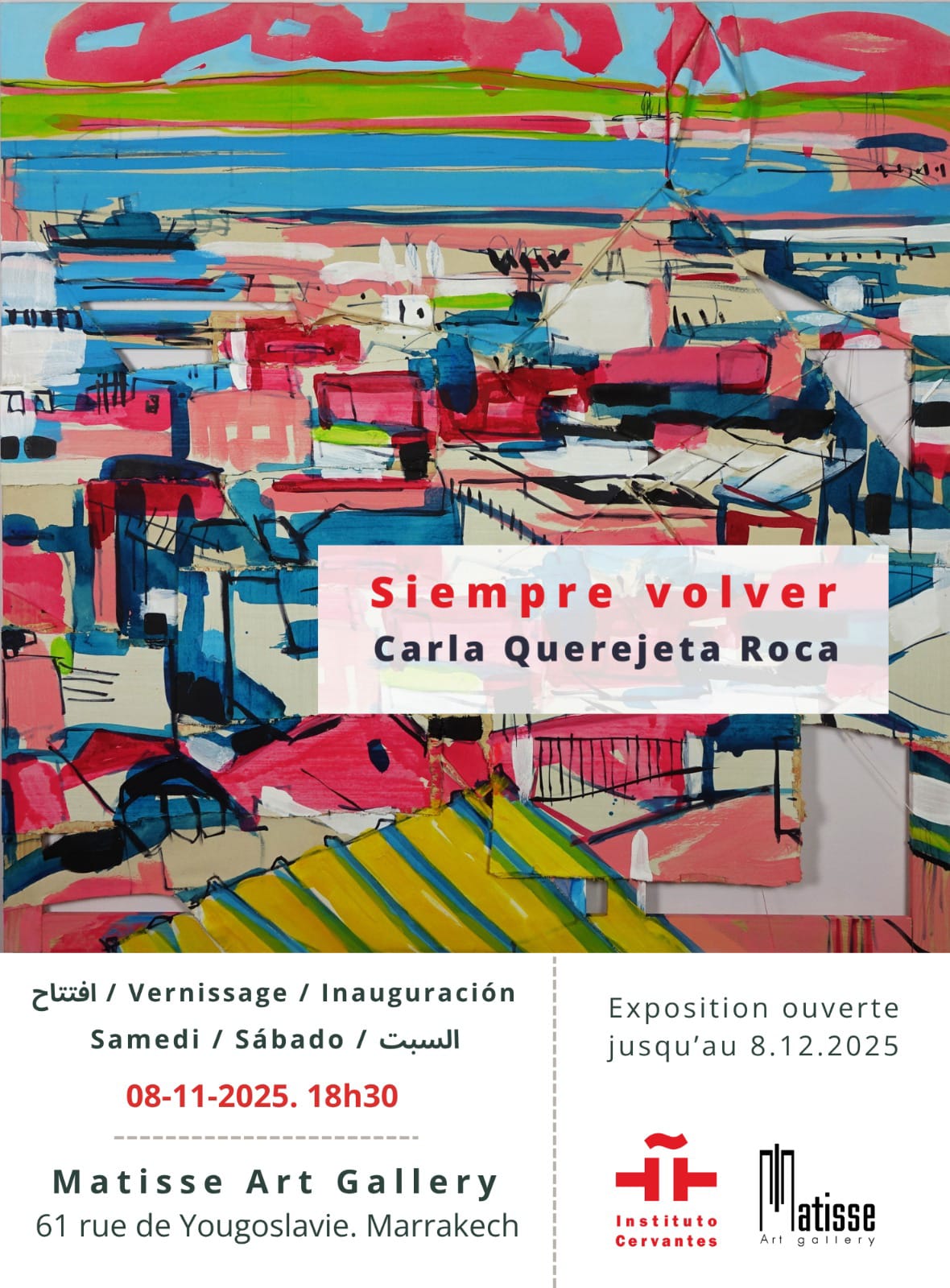 يقدّم معهد ثيربانتيس بمراكش ورواق ماتيس للفنون المعرض الفني «العودة دائماً» للفنانة الإسبانية كارلا كيريخيتا روكا، وهو رحلة تشكيلية مشبعة بالذاكرة والنور والحنين، تمتزج فيها الأمكنة بالعواطف التي شكّلت حياتها ومسارها الفني.