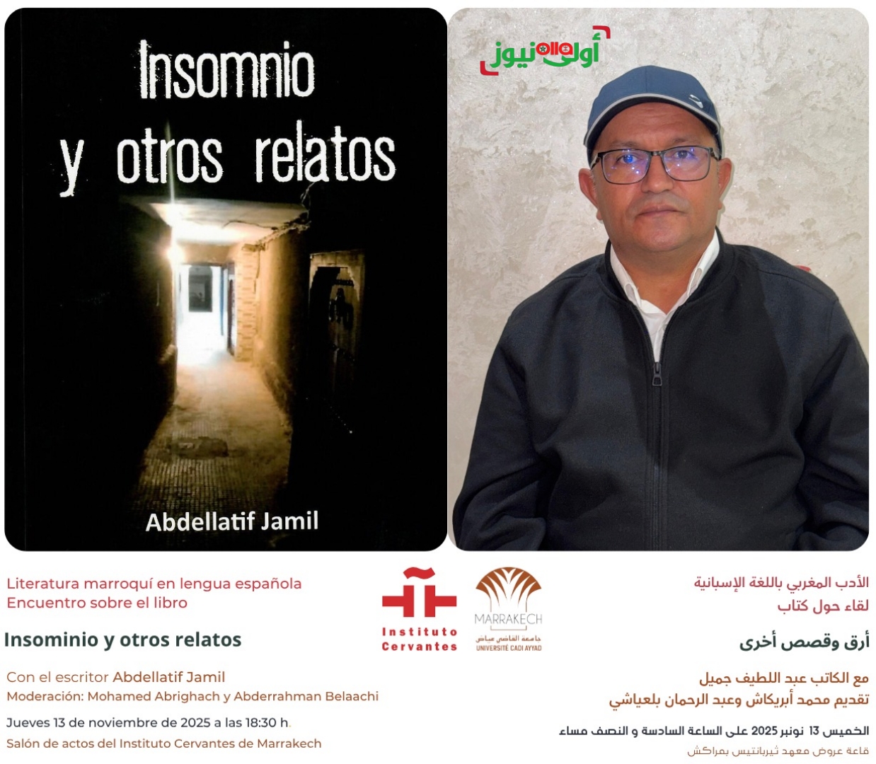 ينظم معهد ثيربانتيس بمراكش بتعاون مع جامعة القاضي عياض بمراكش لقاء مع الكاتب المغربي عبد اللطيف جميل، ابن مدينة مراكش، الذي سيقدّم كتابه أرق وقصص أخرى، وهو مجموعة قصصية رفيعة – صادرة عن دار النشر الإسبانية «ديوان مايريت» – تتقاطع فيها الذاكرة والرغبة والحنين في أسلوب نثري رقيق ومعبر.