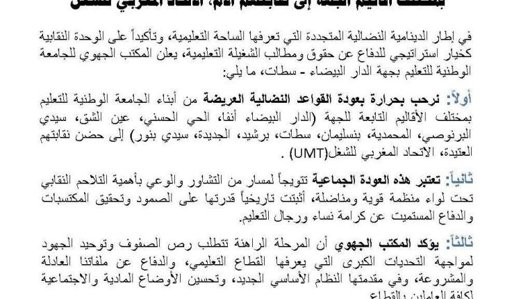 في إطار الدينامية النضالية المتجددة التي تعرفها الساحة التعليمية، وتأكيداً على الوحدة النقابية كخيار استراتيجي للدفاع عن حقوق ومطالب الشغيلة التعليمية، يعلن المكتب الجهوي للجامعة الوطنية للتعليم UMT بجهة الدار البيضاء – سطات، ما يلي: