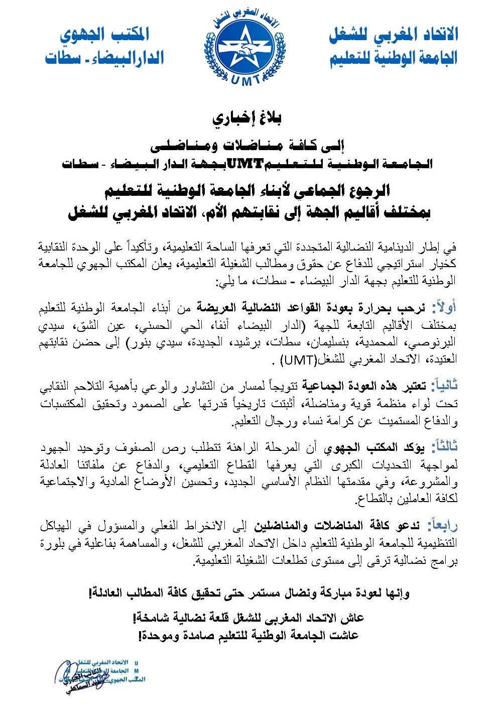 أولاً: نرحب بحرارة بعودة القواعد النضالية العريضة من أبناء الجامعة الوطنية للتعليم UMT بمختلف الأقاليم التابعة للجهة (الدار البيضاء أنفا، الحي الحسني، عين الشق، سيدي البرنوصي، المحمدية، برشيد، سطات، بنسليمان، سيدي بنور) إلى أحضان التنظيم النقابي: الاتحاد المغربي للشغل.