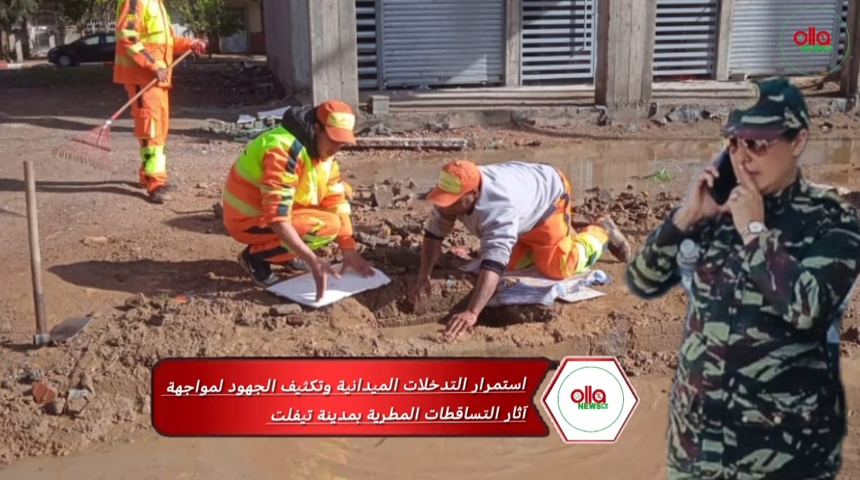 تبعًا للمعدلات العالية للتساقطات المطرية التي عرفتها مدينة تيفلت ليلة الأربعاء 24 دجنبر، واصلت السلطات المحلية تدخلاتها الميدانية المكثفة تحت إشراف باشا مدينة تيفلت بالنيابة “إيمان مماد” في مختلف أحياء المدينة، وذلك في إطار التعبئة الاستباقية الرامية إلى الحد من أي اختلالات محتملة قد تنجم عن غزارة الأمطار.