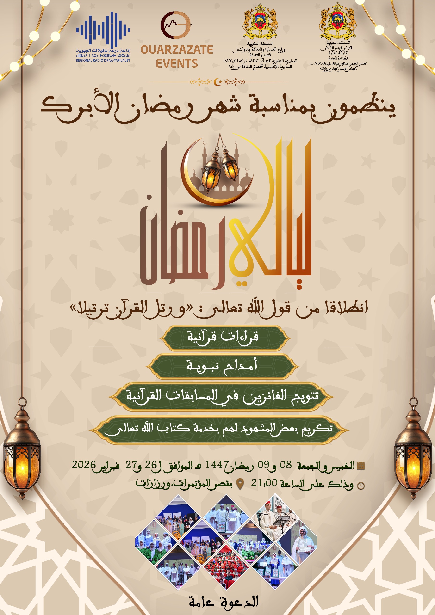 وقد جاء في البلاغ الذي نشره المجلس العلمي المحلي ورزازات ، توصلت اولى نيوز بنسخة منه، أن ليالي رمضان ستنظم يومي الخميس والجمعة: 08 و09 رمضان 1447 هـ. الموافق لـ: 26 و27 فبراير 2026. ابتداءً من الساعة التاسعة ليلاً. بقصر المؤتمرات بمدينة ورزازات، بحيث سيجمع برنامج بين الترتيل والاحتفاء، كما أشار البلاغ.
