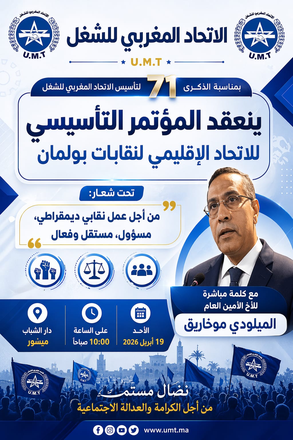 في إطار تخليد الذكرى الحادية والسبعين لتأسيس الاتحاد المغربي للشغل، تحتضن مدينة ميسور أشغال المؤتمر التأسيسي للاتحاد الإقليمي لنقابات بولمان، وذلك يوم الأحد 19 أبريل 2026 بدار الشباب، ابتداء من الساعة العاشرة صباحا.